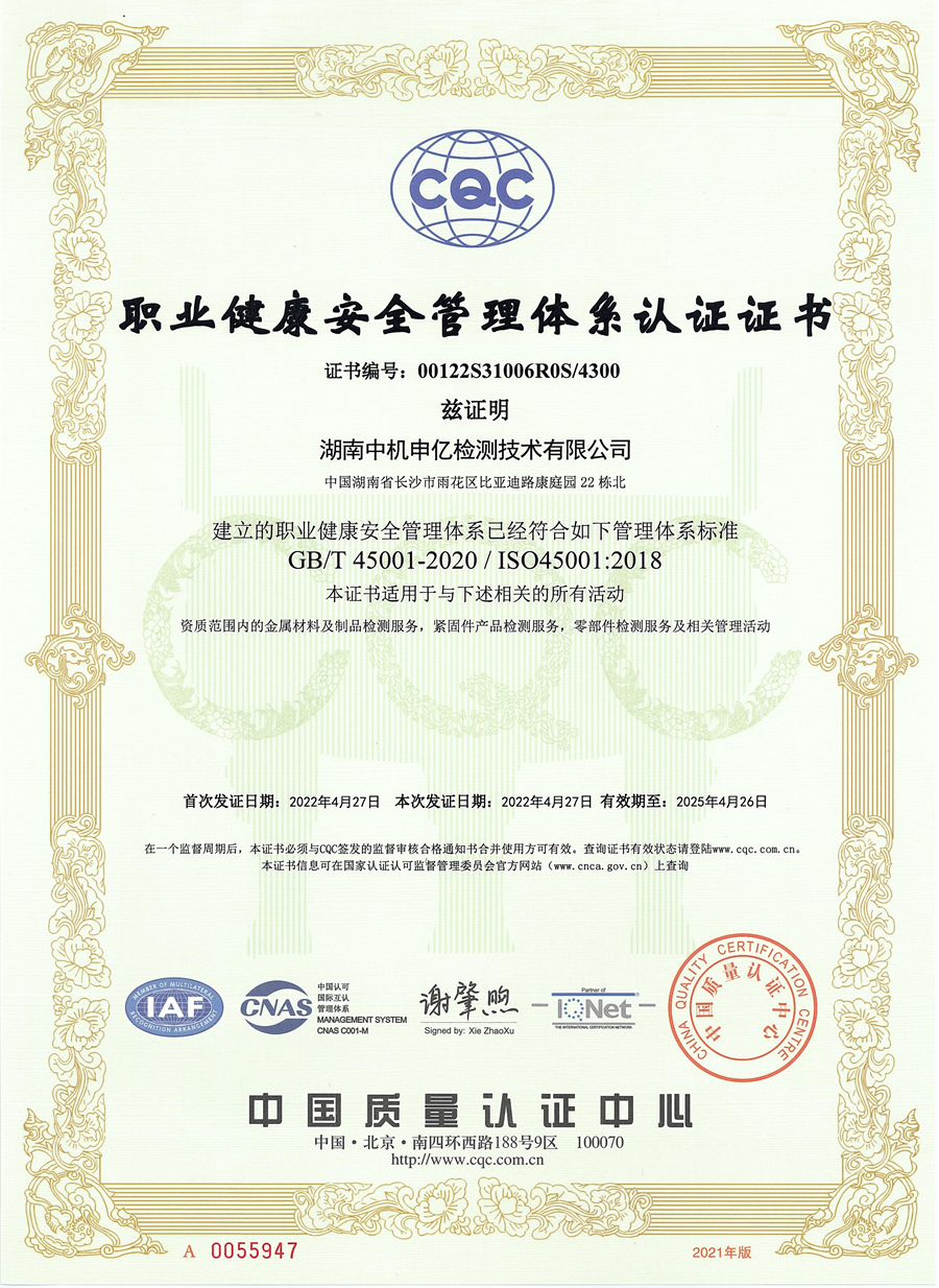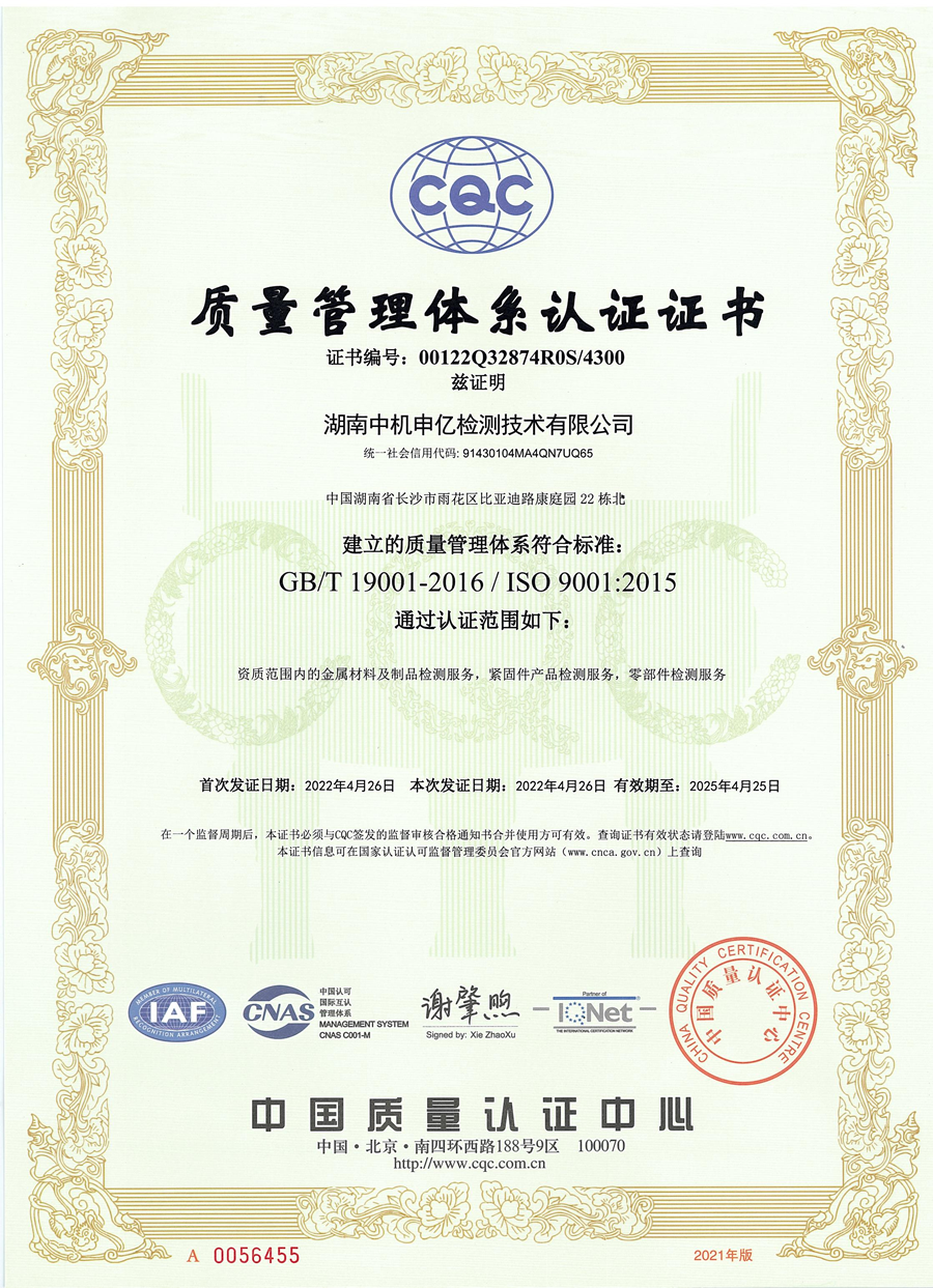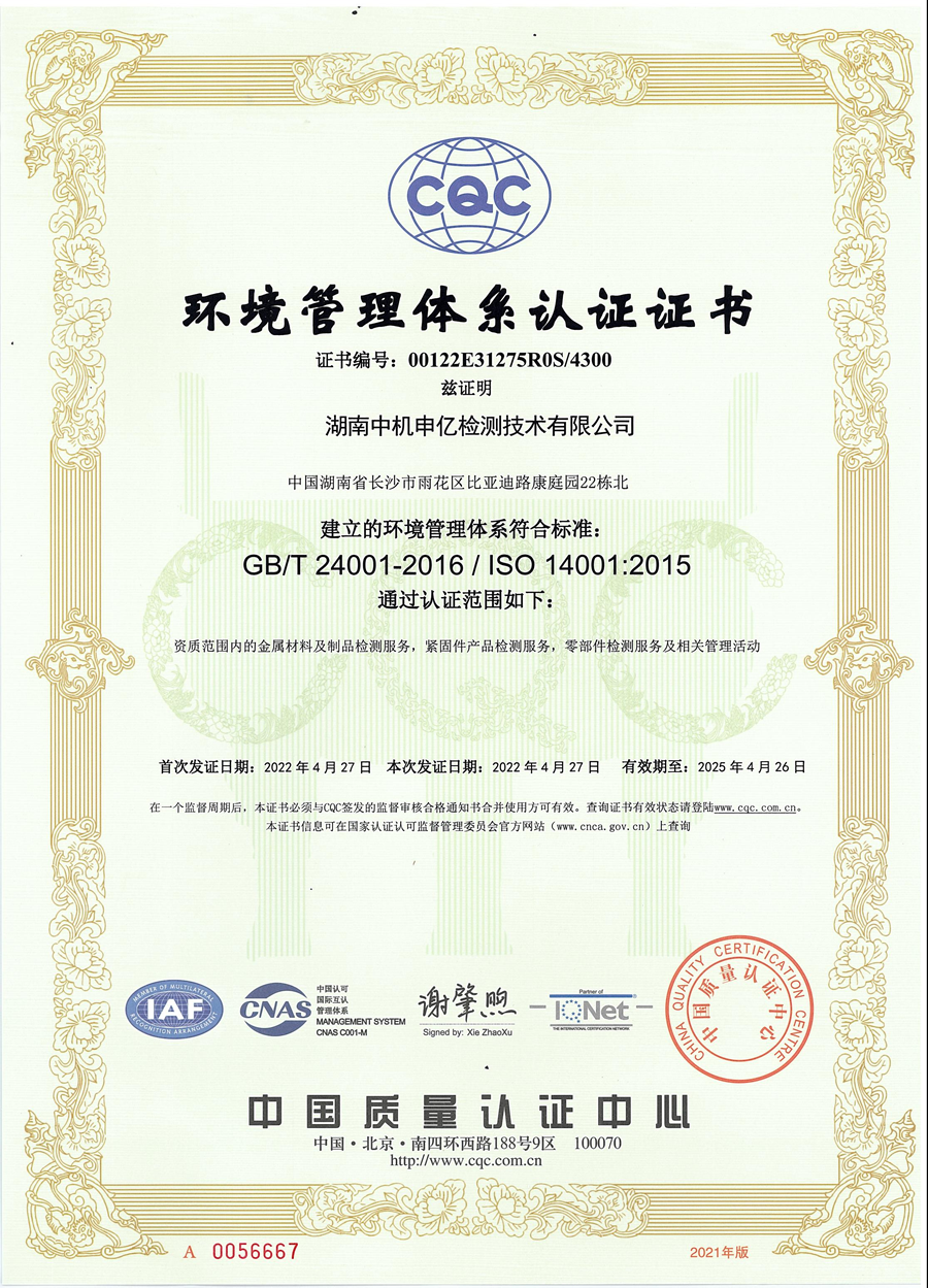 近日湖南中機申億檢測技術有限公司順利通過了ISO 9001質量管理體系、ISO 14001環境管理體系及ISO45001職業健康安全管理體系認證并獲得了認證證書。這標志著公司已步入規范化、標準化、科學化的現代化企業管理軌道,表明公司在質量、環境、職業健康安全體系管理上已達到了國際標準,公司能持續穩定地向顧客提供預期和滿意的服務,同時意味著公司各項管理工作以及品牌文化發展邁上了一個新的臺階。