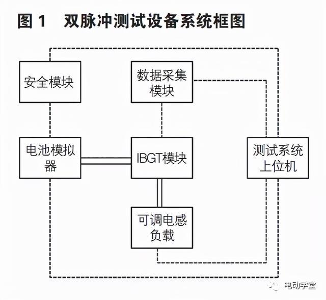 圖1為基于雙脈沖測試原理搭建的測試設備系統框圖,該測試系統由電池模擬器、可調電感負載、數據采集模塊、安全模塊以及上位機組成。通過調節電池模擬器電壓、電感負載可以實現不同電壓以及電流下的IGBT開關特性(開通時間tdon,上升時間tr,關斷延時時間tdoff,下降時間tf,開通能量Eon,關斷能量Eoff,集電極持續工作電流ISC等)、損耗以及安全區,優化驅動參數,選擇合理最小死區時間。