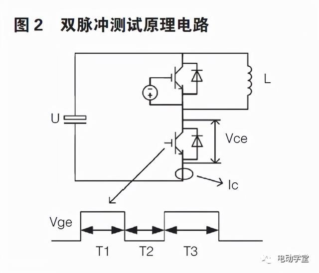圖2為雙脈沖測試原理電路圖,該電路主要由兩個IGBT、一個電感以及電壓源組成。