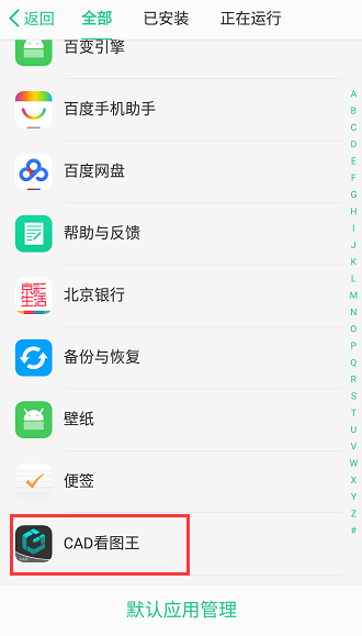 ①打開手機的設置,在應用中找到我們的軟件,浩辰CAD看圖王,點擊;
