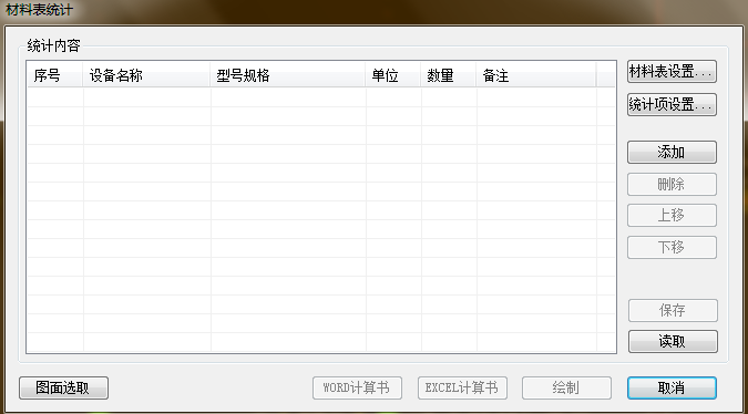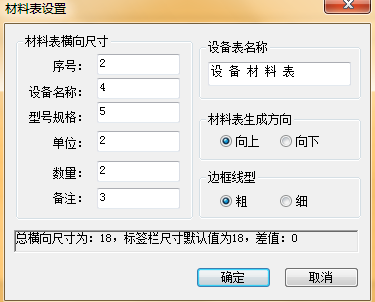 用戶可以設置材料表序號、設備名稱、型號規格、單位、數量、備注、材料表名稱、材料表生成方向、以及表格邊框線型等,在狀態欄顯示材料的主要參數。