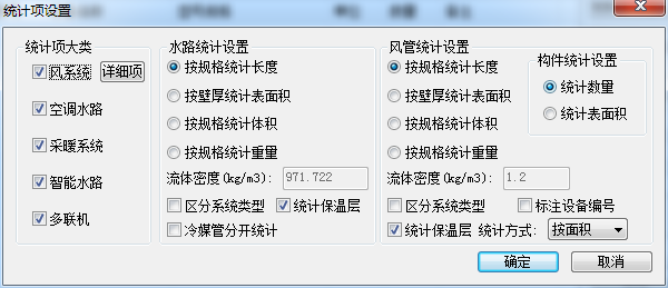 用戶根據需要,勾選統計項的大類,同時對水路統計,風管統計、構件統計設置統計方式。