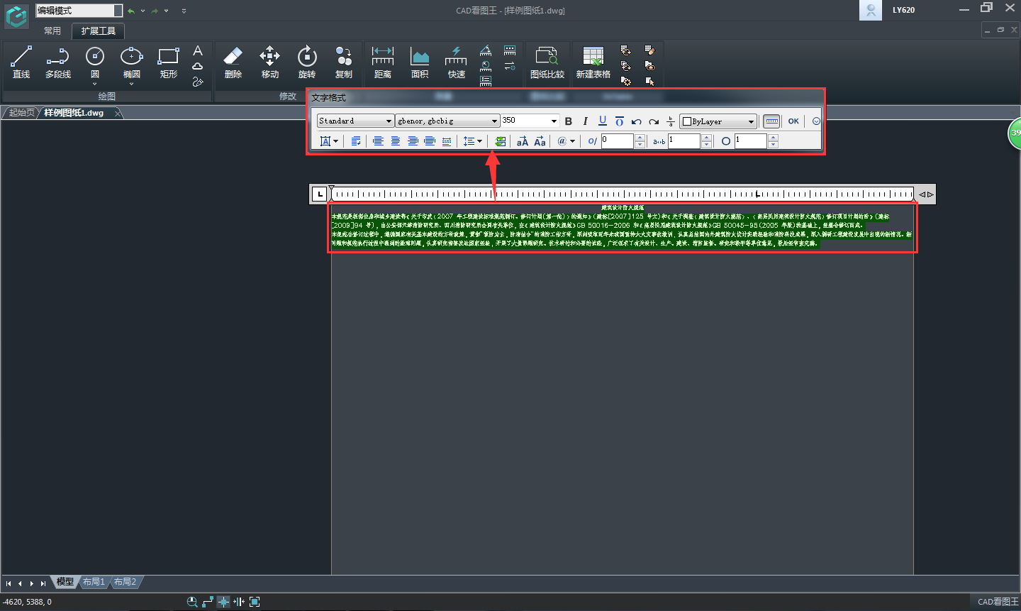 5、點(diǎn)擊文字格式右邊的【OK】按鈕或者在空白處任意點(diǎn)擊一下,返回到圖紙界面,多行文字創(chuàng)建成功。