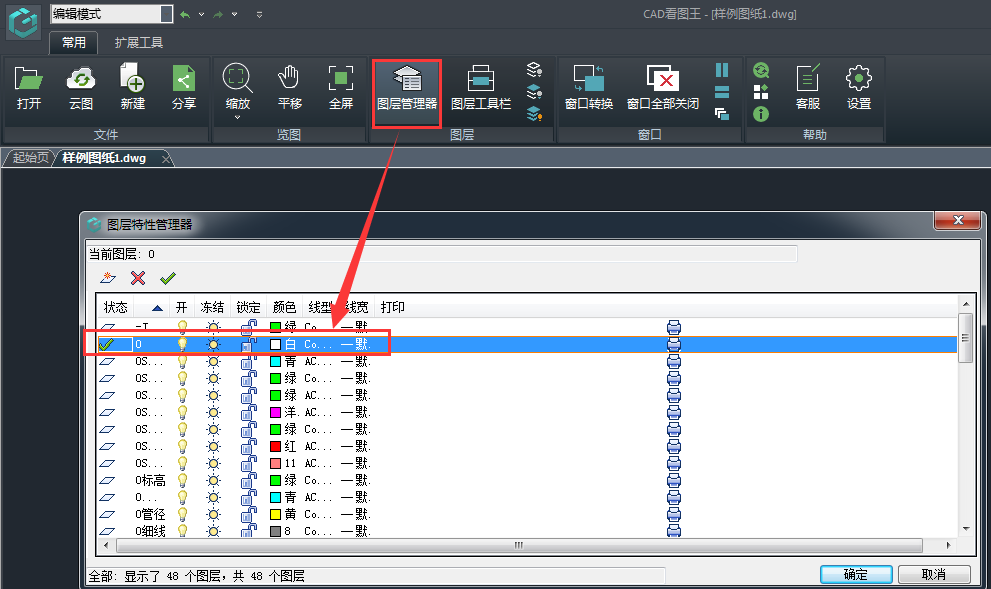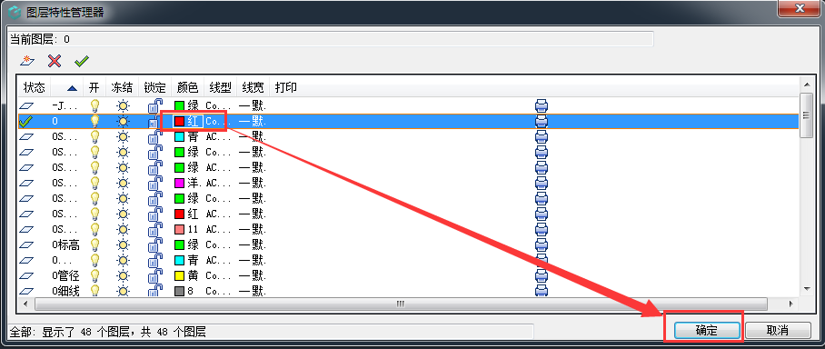 3、打開圖層管理器命令,找到所選對象所在的圖層;
