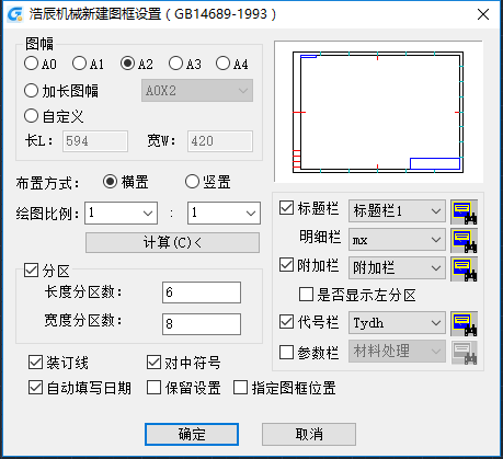 在“浩辰機(jī)械圖紙?jiān)O(shè)置”對(duì)話框中,列出了符合我國(guó)機(jī)械制圖標(biāo)準(zhǔn)的各種規(guī)格的基本幅面為A0,A1,A2,A3,A4,國(guó)標(biāo)推薦為第一選擇,用戶根據(jù)需要點(diǎn)取按扭即可。