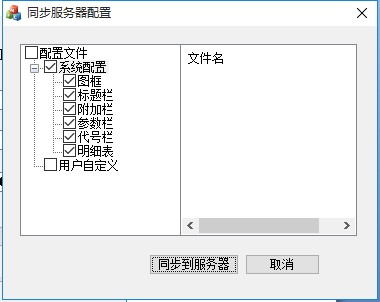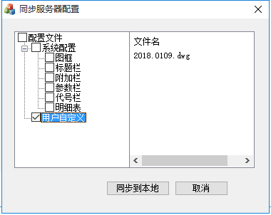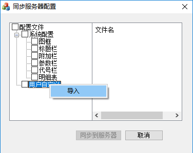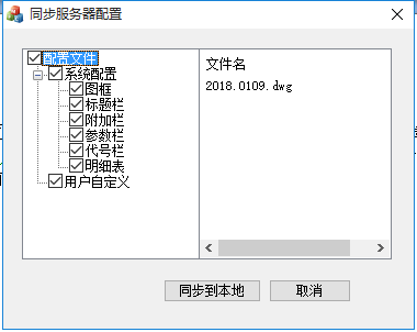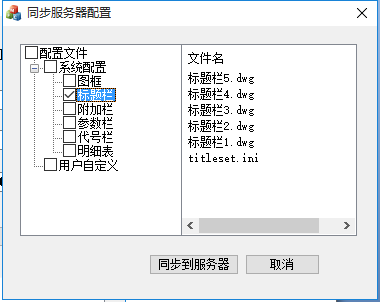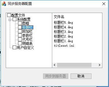 ①選擇【同步到服務器】時,按下【登錄】Button,顯示“同步服務器配置”對話框, 雙擊“系統配置展”開列表,顯示“圖框”、“標題欄”等六個系統配置,單擊任一配置,系統從機械軟件本地安裝路徑中查找相應的配置文件,顯示在右側“文件名”下,如果配置文件不存在,右欄空白表示。例如:單擊“標題欄”,系統在安裝目錄中title文件夾下查找配置文件,并在右欄中顯示,如下圖2所示: