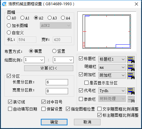 在浩辰CAD機械軟件中,調用菜單欄:【浩辰機械】→【圖紙】→【主圖框修改】或輸入“TZ”命令,就會彈出“浩辰機械主圖框設置”對話框,如圖1所示: