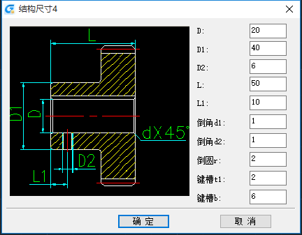 可參照圖示對齒輪內非主尺寸及局部結構的尺寸進行修改。本功能提供了圖形圖元在參數不合理時的干涉判斷。例如:輸入倒角過大時會提示“d 大于全齒高”。螺孔尺寸錯誤時會提示“螺孔空間不足,或與其他尺寸沖突。其他結構形式的使用方式與類型4一致。