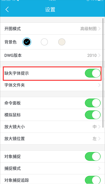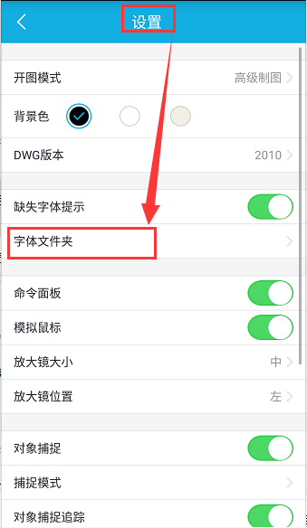 3、下載缺失的字體,并傳到手機上,打開CAD看圖王軟件,點擊設置,字體文件夾;