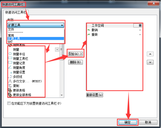 在彈出的快速訪問工具欄對話框中,在類別的下拉菜單中選擇,相關的命令分類,然后在下方顯示出具體的命令,選擇需要的命令,點擊添加,將其添加到右側的方框中,點擊確定即可。
