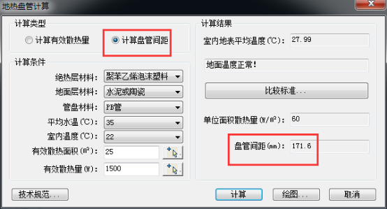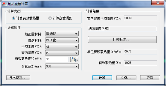 有關說明:計算條件:確定好地面層材料、管盤材料后,在左下角【技術規范】處可查相關的設計規范 。