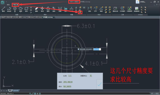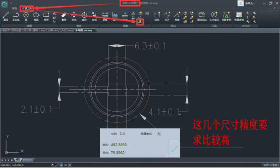 上圖中黃色虛線顯示的部分就是點擊了一下圓,圓面積和周長就顯示在下方了。就是這么簡單,在浩辰CAD看圖王電腦版中打開需要測量圓面積的圖紙,進入擴展工具欄中,選擇圓面積測量功能之后,直接在界面上點擊需要測量的圓,圓面積和周長就顯示在界面的下方了。