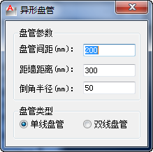 用戶可以輸入盤管間距、距墻距離、倒角半徑三個參數,并且均為實際尺寸;還可以選擇單線盤管或者雙線盤管二種類型。