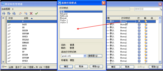 分別打開一個使用CTB和STB的圖紙,打開圖層管理器,就可以很明顯地看出區別了,在使用CTB打印樣式的圖紙中,圖層的“打印樣式”一欄是灰色的,不能修改,顯示的就是顏色編號,與圖層顏色對應,例如設置為白色,樣式就顯示為color_7。而在使用STB的圖中,“打印樣式”默認為“Normal”或“普通”,并且是可以編輯的,單擊后可以在對話框中選擇STB文件中設置好的樣式,如下圖所示。