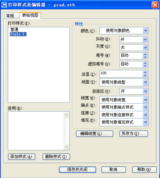 命名相關打印樣式表的設置選項跟CTB相同,只是左側對應的不是顏色,而是我們定義的樣式名,如下圖所示。默認的STB通常只有一個“普通”樣式,其他樣式是需要自己添加的,右側輸出特性設置與CTB文件相似。