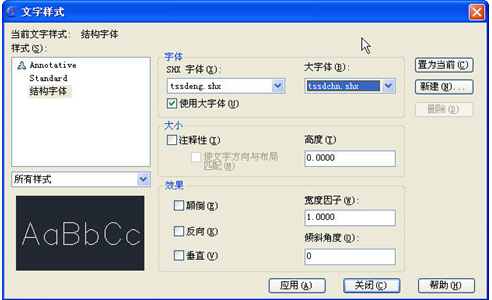 結構這些特殊符號可能在不同字體中存在不同的定義方式,浩辰CAD中輸入鋼筋符號比較常用的是:小字體:tssdeng.shx,大字體:tssdchn.shx。字體放到CAD的FONTS目錄下后,文字樣式的設置如下: