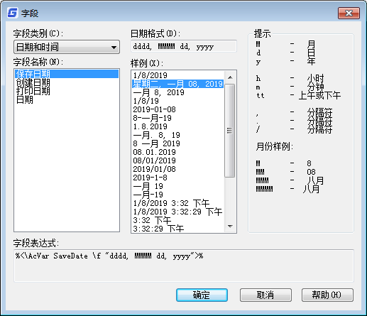 字段不僅可以單獨(dú)插入,也可以在單行文字、多行文字、屬性文字的值中插入字段。單獨(dú)插入字段的話,直接輸入field命令,或者在菜單中選擇:插入>字段;彈出對(duì)話框如下: