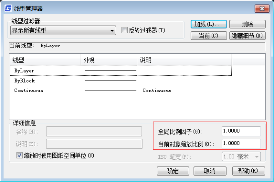 線型比例有下面設置。在線型資源管理器(也就是加載線型的那個對話框)里有兩個設置:一個是“全局比例因子”,這個參數會影響圖中所有線,也就是每條線的線型比例都會乘上這個因子;一個是“當前對象縮放比例”,它會影響設置后繪制的所有圖形。如果你的對話框中看不到這兩個選項,你看看對話框右上角有一個“隱藏細節”按鈕,你點一下,這兩個選項就出來了。如下圖所示。