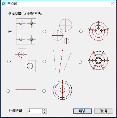 在浩辰CAD機械軟件中調用【浩辰機械(M)】→【繪圖工具(D)】→【中心線(C)】→【帶孔的十字中心線(H)】或輸入“GMCENCRHOLE”命令,按 ENTER 鍵顯示“選擇中心線選項”對話框,如下圖所示: