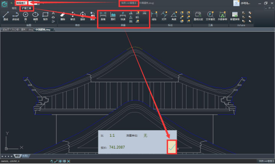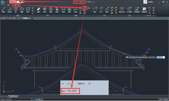 步驟三:選擇測量弧長功能并在圖中選擇弧形進行測量,即選擇圓弧或多段線的圓弧部分。