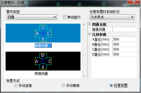 功能: 手動連接,手動替換或者任意布置水管構件,含變徑、彎頭,三通和四通等。