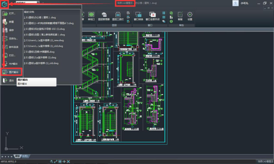 步驟二:點(diǎn)擊界面左上角“浩辰CAD看圖王”電腦版軟件“logo”,在出來的下拉菜單中選擇“圖片輸出”功能。