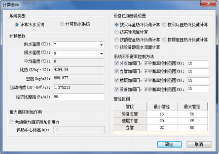 用戶可以在設計計算條件中輸入供、回水溫度,經濟比摩阻大小,如果需要考慮重力循環附加作用時,可以輸入供熱中心的標高值,以及不平衡率控制的大小和管徑區間范圍的選定。對于窗口中不能輸入的數據值,如比熱。軟件都是按其與溫度的函數值計算所得。