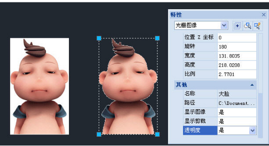 如果圖像的裁剪邊界很復雜,需要跟圖像內容的邊界貼合得非常好的話,就不建議用多段線邊界來裁剪了,這樣太復雜了,可以利用圖像處理軟件對圖像進行處理,然后利用透明功能來處理圖像了,比如說將圖片保存為帶透明區域或通道的PNG\TGA\TIF文件,插入圖像后,將圖像屬性設置為透明,如下圖所示。