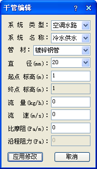 對話框顯示選擇的管線的一些參數,用戶可以修改這些參數,其中沿程阻力由比摩阻和管線長度計算所得,不允許修改,終點標高與起點標高一致,不允許修改;