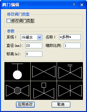 應用修改:將修改后的對話框參數應用到所選擇閥門中,如參數對應值為*多種*時,將不應用該項參數修改;