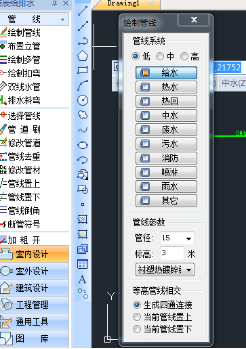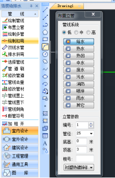 用戶可繪制不同系統(tǒng)的立管,并對(duì)管線的參數(shù)、管材進(jìn)行設(shè)置。用戶選擇要繪制的系統(tǒng),在平面圖中確定立管和編號(hào)的位置即可實(shí)現(xiàn)繪制立管。