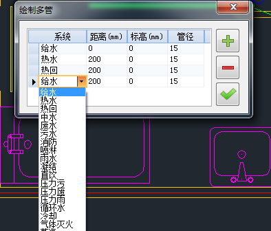 2.用戶執行命令,不選立管右鍵鼠標,同時彈出如圖對話框:確定管線起點,即可實現多管的繪制。用戶可通過【+】按鈕,添加多種系統的管線同時繪制,可設置管線間距及其余選項。