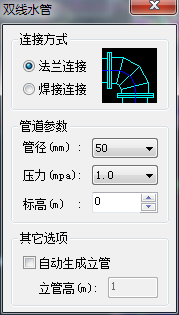 用戶運行室內菜單中的【管線】-【雙線水管】命令,彈出如圖,可以對雙線水管參數進行設置,點擊管線位置進行繪制。