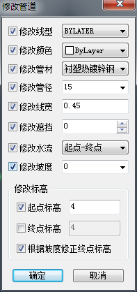 執(zhí)行“修改管道“命令,選擇圖面上的管線對(duì)象,彈出右側(cè)對(duì)話(huà)框,將需要修改的屬性前面的復(fù)選框選中,輸入新的數(shù)值,點(diǎn)擊確定即可完成對(duì)管線屬性值得修改。