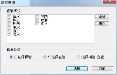 可以對(duì)某個(gè)系統(tǒng)的管線及立管進(jìn)行批量選擇。可以對(duì)某個(gè)系統(tǒng)進(jìn)行僅選擇立管或者僅選擇橫管、也可以選擇立管+橫管(三種模式任選其一)。
