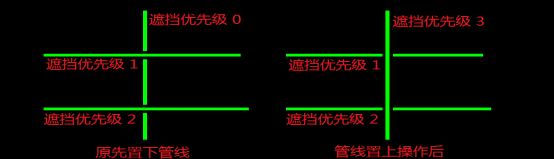 執(zhí)行此命令可快速的進(jìn)行斷線處理,修改同標(biāo)高下管線遮擋優(yōu)先級(jí)別,使其置于其它管線之上/之下。對(duì)應(yīng)標(biāo)高不同的管線,軟件會(huì)根據(jù)標(biāo)高關(guān)系自動(dòng)處理其遮擋關(guān)系,此時(shí)遮擋優(yōu)先級(jí)不起作用。
