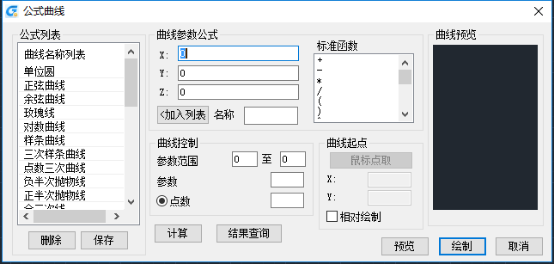 繪制曲線:如果“曲線名稱列表”中存在公式曲線,可以從曲線名稱列表中選擇一個公式曲線,或者直接在“曲線參數公式”組框和“曲線控制”組輸入相應的X、Y、Z參數公式,參數的范圍,點數。然后執行“計算”,“結果查詢”可以獲得通過計算得到的點值。