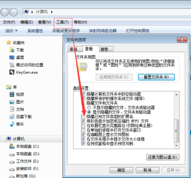 解決辦法就是將系統資源管理器的設置選項改回來,再改擴展名,WIN7的設置如下圖所示:
