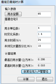用戶運行室內菜單中的【計算】-【高日高時】命令,進行最高日最高時用水量的計算,同時還可估算住宅入戶管管徑和流速。