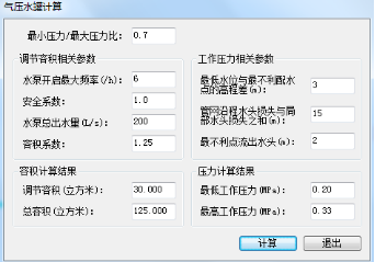用戶運行室內菜單中的【計算】-【氣壓水罐】命令,計算氣壓罐的容積和工作壓力。
