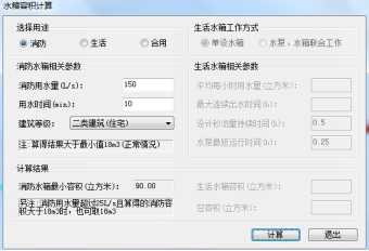 用戶運行室內菜單中的【計算】-【水箱計算】命令,計算生活、消防和生活消防合用的水箱容積。