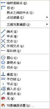 有一個小技巧,大家可以試一試。在連接圓的象限點時,當激活直線命令后,按住CTRL(或者SHIFT)鍵,同時單擊鼠標右鍵,會出現下圖所示的對話框,大家可以快速選擇自己需要捕捉的點。