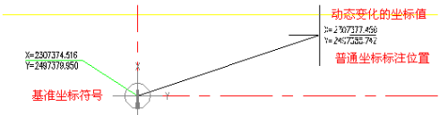 請點取基準坐標標注點<退出>:點取要標注的基準坐標位置點,一般為已有精確坐標的紅線界點;