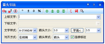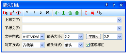 在對話框中輸入引線端部或者引線上下要CAD標注的文字,可以從下拉列表選取命令保存的文字歷史記錄,也可以不輸入文字只畫箭頭,對話框中還提供了更改箭頭長度、樣式的功能,箭頭長度按最終圖紙尺寸為準,以毫米為單位給出;箭頭的可選樣式有“箭頭”、“半箭頭”、“點”、“十字”、“無”共5種。
