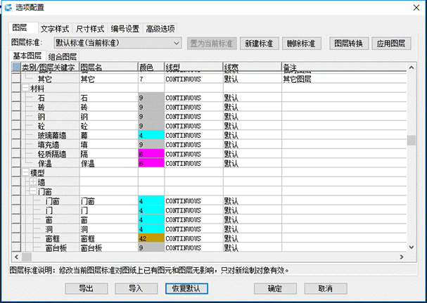 只要是用浩辰建筑命令畫出來的東西,都有它默認的圖層名稱、顏色、線型,說明中還告訴你這個圖層是干嘛用的。學習軟件的時候,把這個研究一下,很有好處。參加工作以后,一些比較大的公司會把默認的圖層名稱、顏色等改掉,比如把紅色的軸線改成灰色(色號8),門窗改成深藍色(色號5),不過也有公司是不予修改的,所以記住不同圖層對應的名稱和顏色,對快速繪圖有很大幫助。